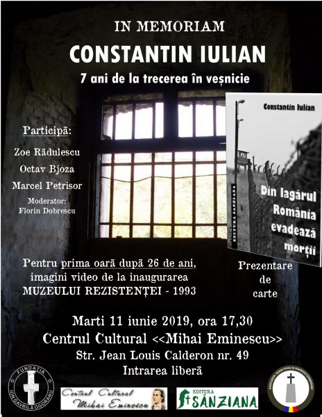 Cu ocazia împlinirii a 7 ani de la trecerea în veșnicie a mărturisitorului și luptătorului anticomunist CONSTANTIN IULIAN, vă invităm la o manifestare memorială dedicată vieții, luptei și mărturisirii acestui sfânt al temnițelor comuniste.