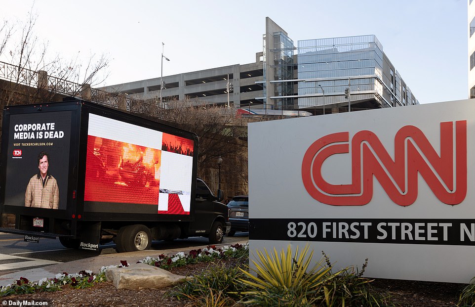 Tucker Carlson atacă marile companii de știri și instalează panouri publicitare în fața sediilor…